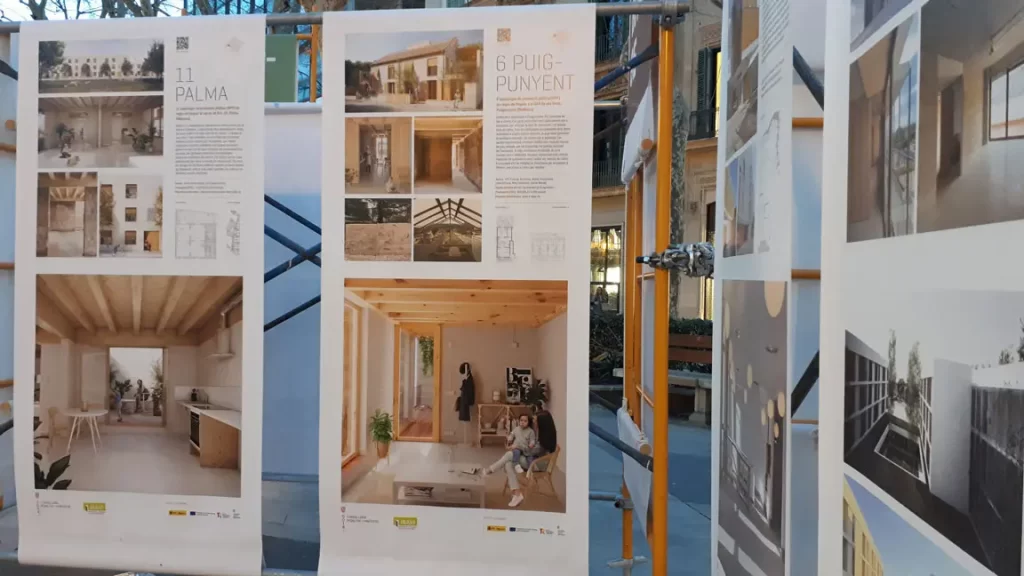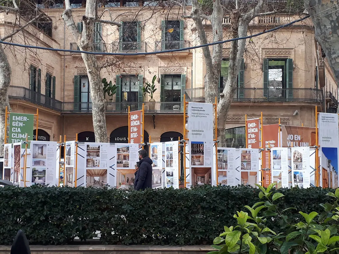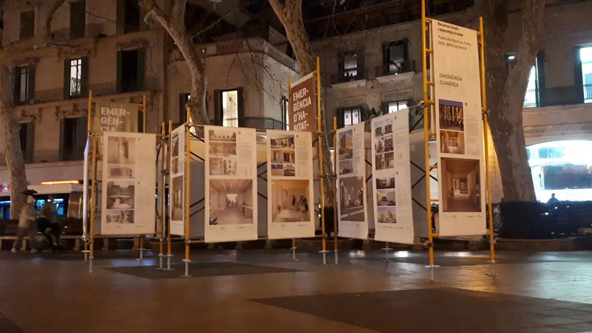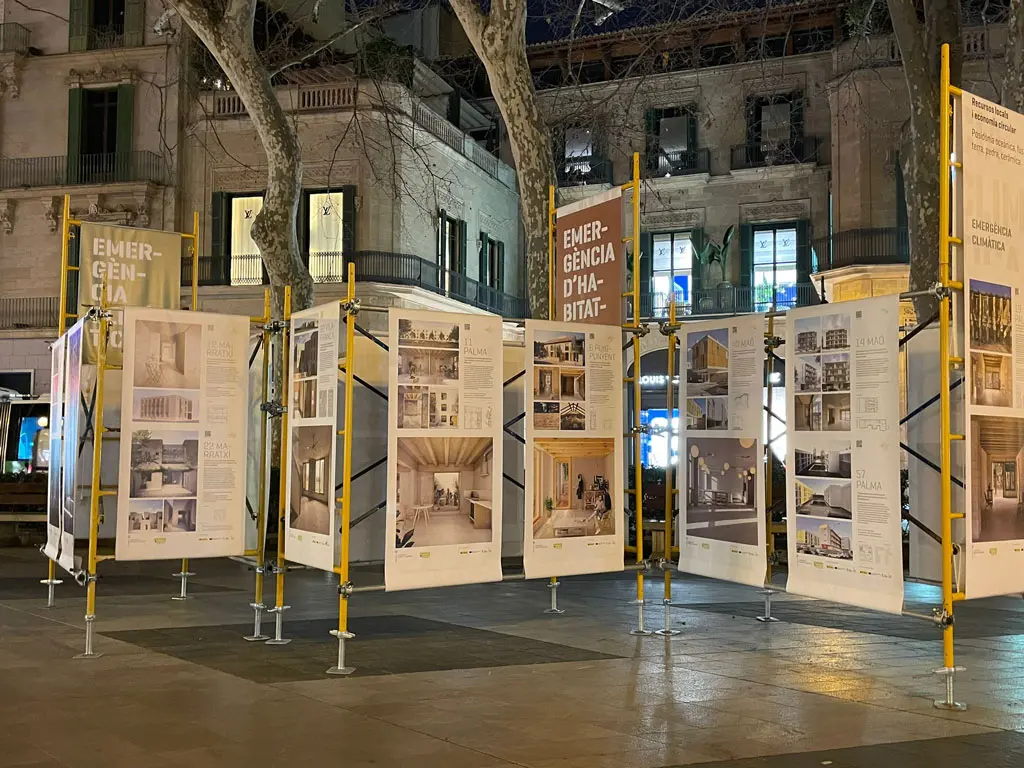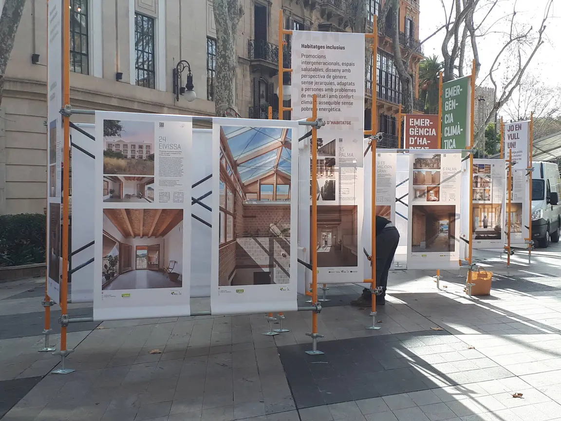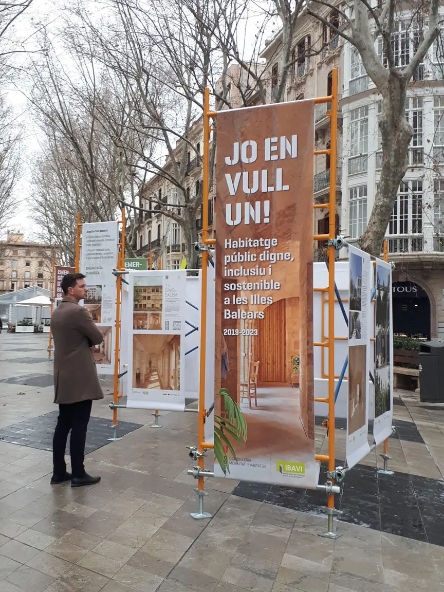 Durante los últimos años, el IBAVI ha tenido como objetivo combatir la emergencia habitacional i climática en las Islas Baleares planteando estrategias que garanticen un nuevo modelo de vivienda pública de calidad y respetuosa con las personas y el medio ambiente. La exposición situada en el paseo principal de Palma, recogía los proyectos realizados entre el 2019 y 2023 y conceptualmente debía contemplar el uso de materiales de bajo impacto ambiental, su reciclaje, las inclemencias meteorológicas y un coste reducido.El uso de un andamio convencional en alquiler como soporte básico, reutilizable, desmontable, estable, versátil y apto para uso exterior, sirvió para estructurar todo el proyecto, aportando una referencia contextual y simbólica al ser un elemento de uso habitual en la construcción. El desmontaje incluyo la devolución de todo el material de soporte para continuar con su uso habitual y la propuesta de repartir las lonas impresas de los proyectos entre los estudios de arquitectura participantes, acercando la huella de carbono a niveles muy bajos y los residuos casi a un 0%.